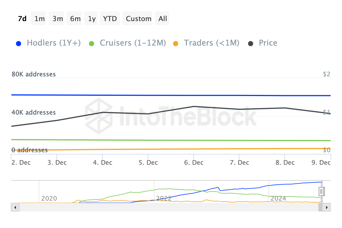 BeInCrypto’nun analizine göre, CRV’nin güçlü performansı büyük ölçüde kısa vadeli sahipler arasındaki duyarlılıktan kaynaklanıyor. IntoTheBlock verileri, son yedi gün içinde kısa vadeli CRV sahiplerinin sayısında önemli bir artış olduğunu gösteriyor.