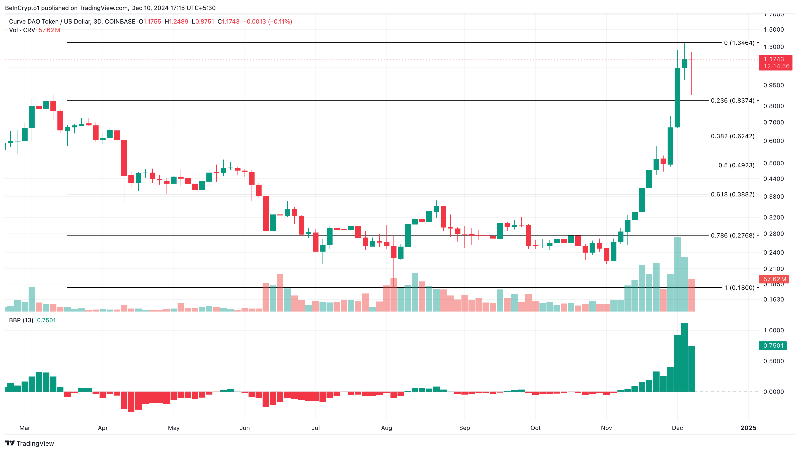 3 günlük CRV/USD grafiğinde, Bull Bear Power (BBP) pozitif bölgede kalmaya devam etti. BBP, alıcıların (boğalar) gücünü satıcılarla (ayılar) karşılaştırır. Gösterge pozitif ve yeşil histogram çubuklarıyla okunduğunda, boğalar üstünlük sağlar.