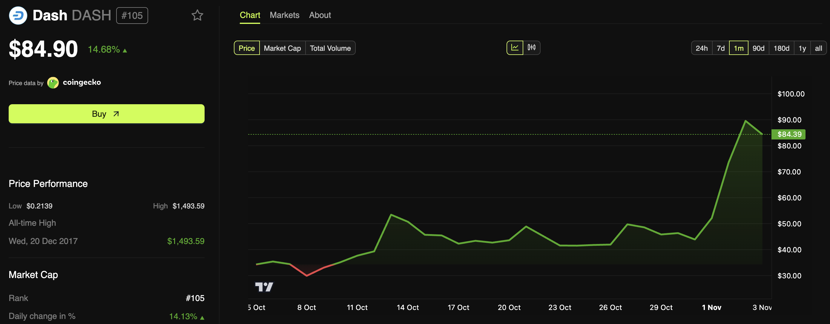 Bu yazı yazılırken, altcoin’in fiyatı 84,9 dolar seviyesinde işlem görüyor ve son 24 saatte neredeyse %15 bir artışı temsil ediyor. Bu yükseliş, DASH’i CoinGecko üzerinde günlük en çok kazananlar arasında yer aldı.
