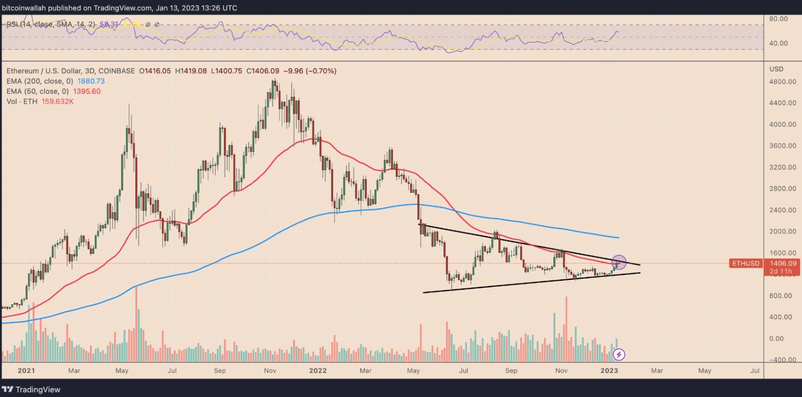 Kripto para analisti Gola, ETH fiyatının simetrik üçgen formasyonunu kırması gerektiğine işaret etti. Deneyimli analist, üçgenin üst direnç çizgisi ile alçalan trend çizgisinin kesiştiğine dikkat çekti. 3 günlük grafiğe bakan Yashu Gola ETH’nin 2.000 dolarda yer alan dirence yaklaşabileceğine dikkat çekti: