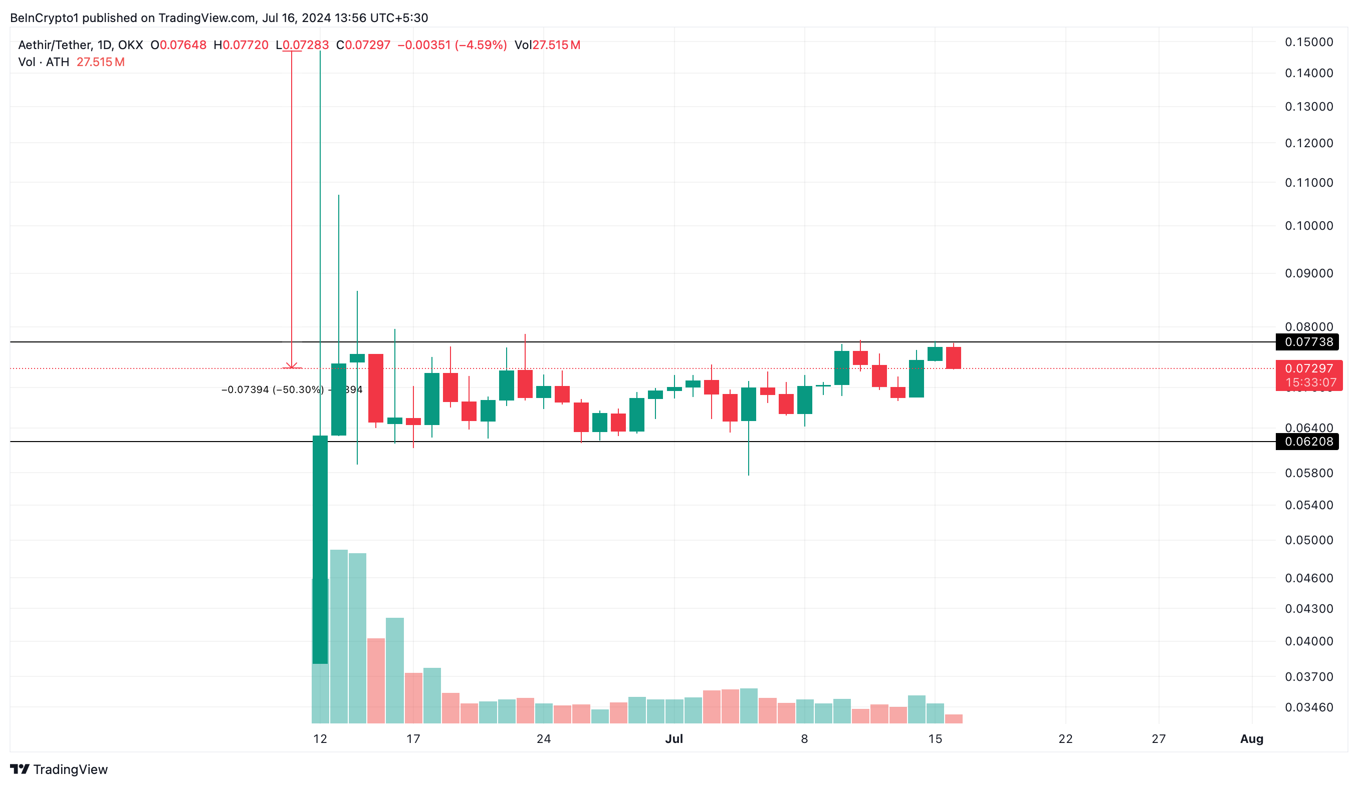 Bu ilerlemelere rağmen, ATH’nin fiyat performansı kripto borsasında zorlanıyor. Geçen ay 0,14700 dolar seviyesine ulaştıktan sonra, fiyat yaklaşık yüzde 50 düşüş yaşadı. Şu anda 0,07738 dolar ile 0,06208 dolar arasında dalgalanıyor.