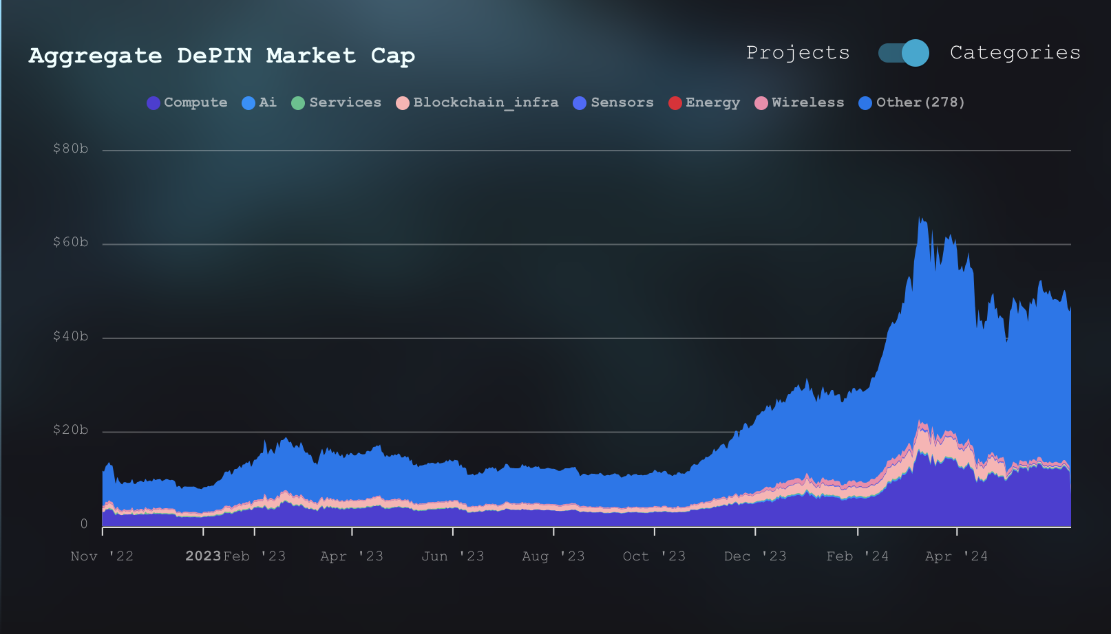 Projeler, merkeziyetsiz kablosuz ağlardan topluluk odaklı enerji şebekelerine kadar uzanıyor ve DePin teknolojilerinin çeşitli uygulamalarını sergiliyor. Piyasa değerine göre, ilk beşte Fetch.ai (4,3 milyar dolar), Render (3,56 milyar dolar), Filecoin (3,3 milyar dolar), The Graph (2,5 milyar dolar) ve Arweave (2,5 milyar dolar) yer alıyor.