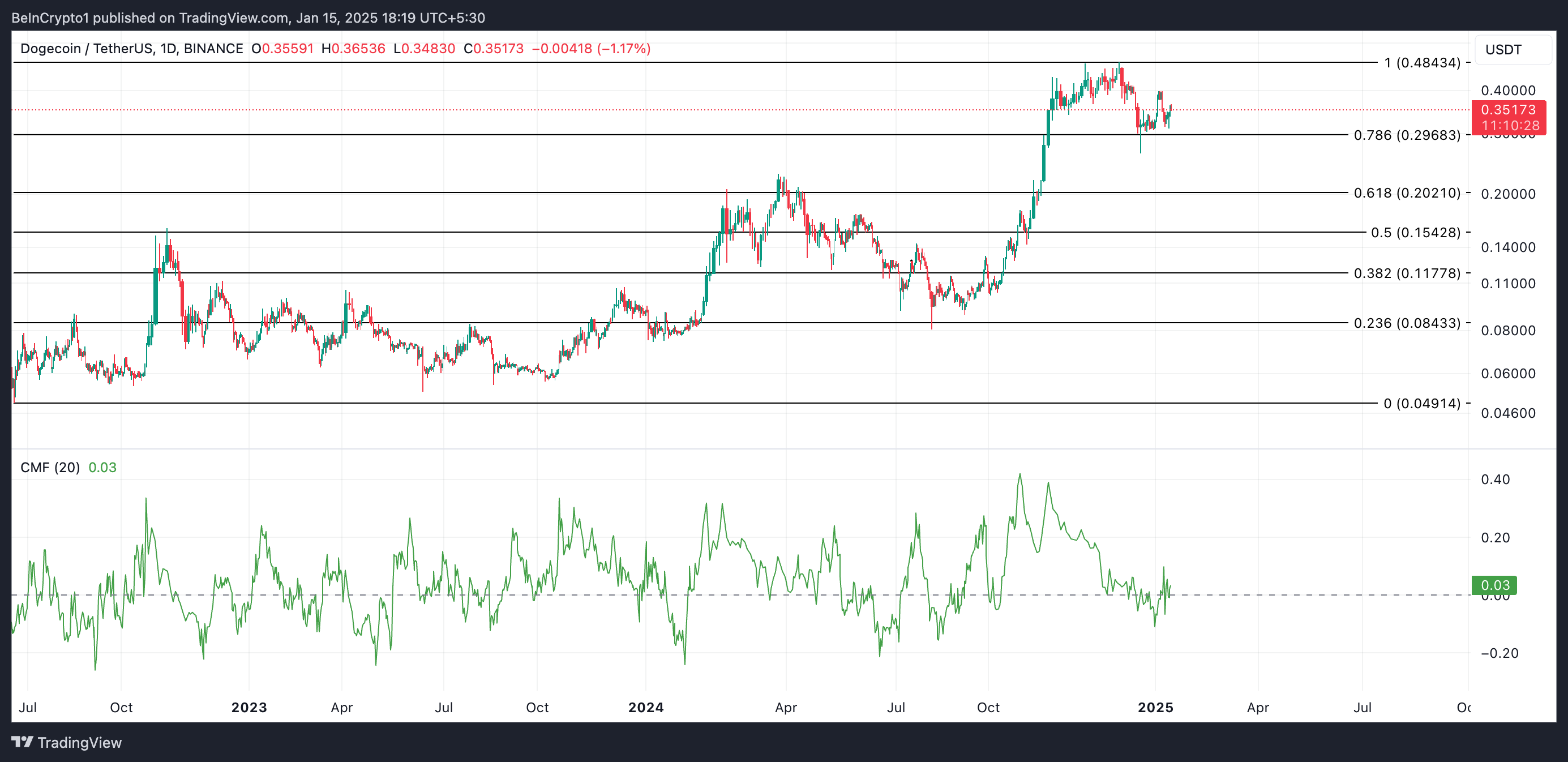 Günlük grafikte, DOGE’un Chaikin Para Akışı (CMF) artan birikimi yansıtıyor. Bu yazı itibarıyla, momentum göstergesi %0,03 seviyesinde yukarı yönlü bir trendde.