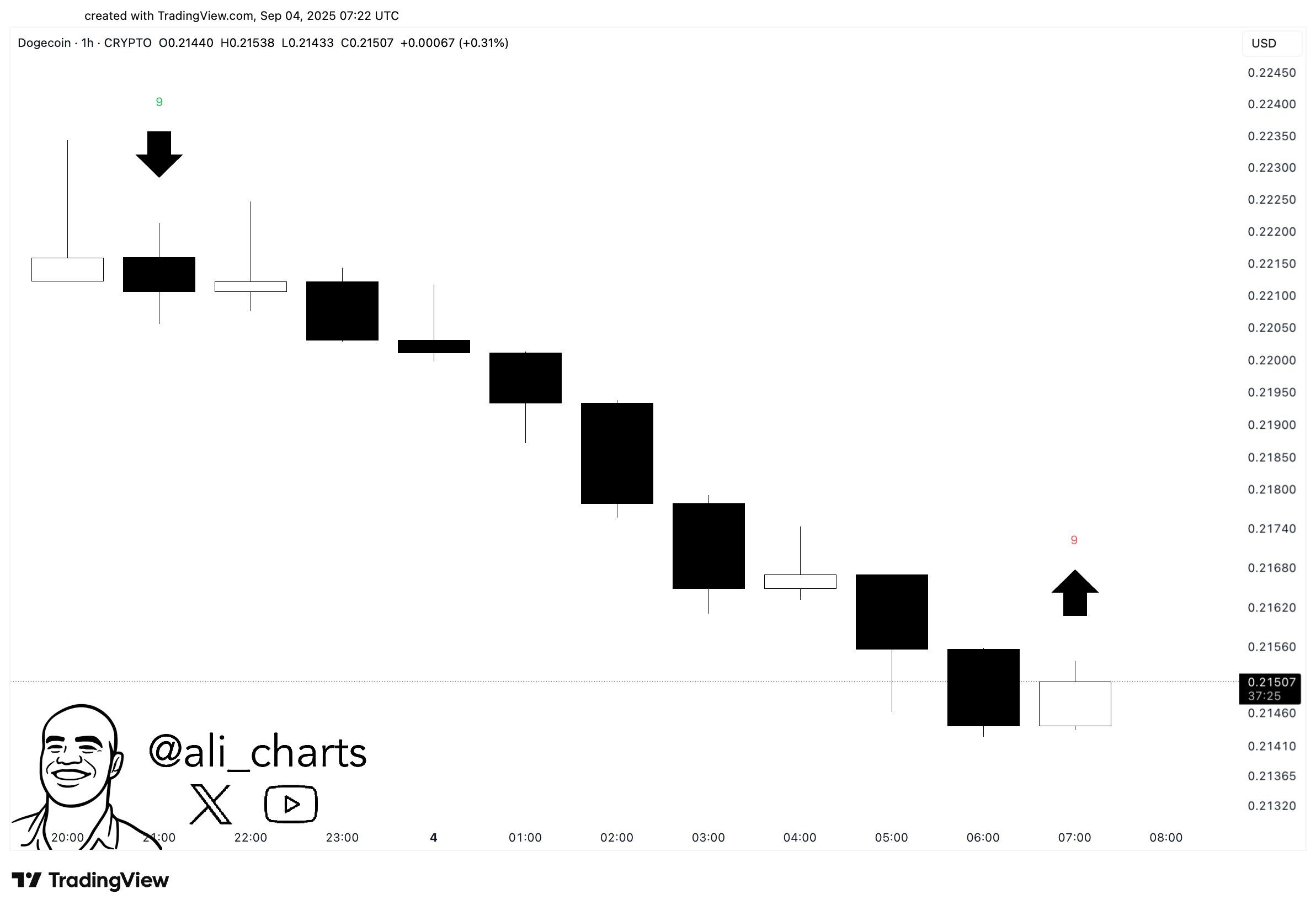 Bir yandan, analist Ali’ye göre, TD Sequential indikatörü yakın zamanda zirve yaptı, ancak şimdi DOGE için bir alım sinyali veriyor.