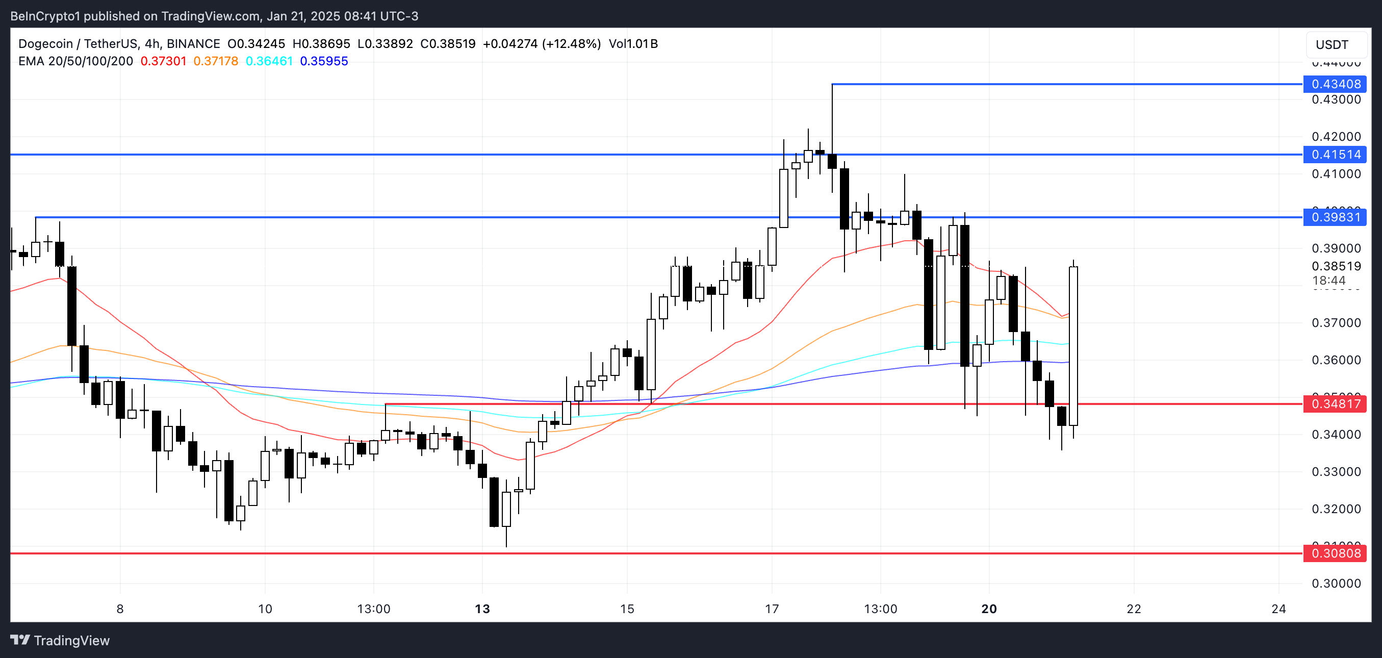 0,415 Dolar’ın başarılı bir şekilde aşılması, DOGE fiyatını daha da yukarı taşıyabilir ve son olumlu haberlerden kaynaklanan ivme ile 0,43 Dolar aralığına ulaşabilir.