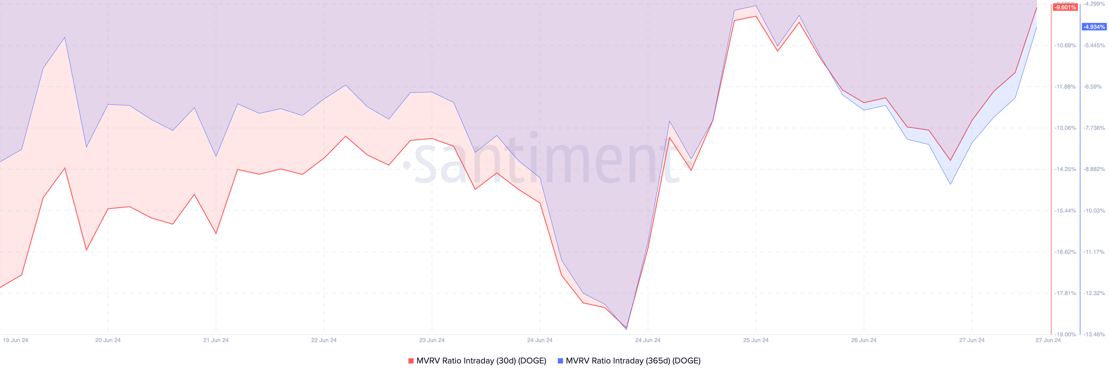 Yazının kaleme alındığı sırada, DOGE’nin 30 günlük ve 365 günlük hareketli ortalamalara dayalı MVRV oranları sırasıyla -%9,6 ve -%4,93 olarak ölçüldü.