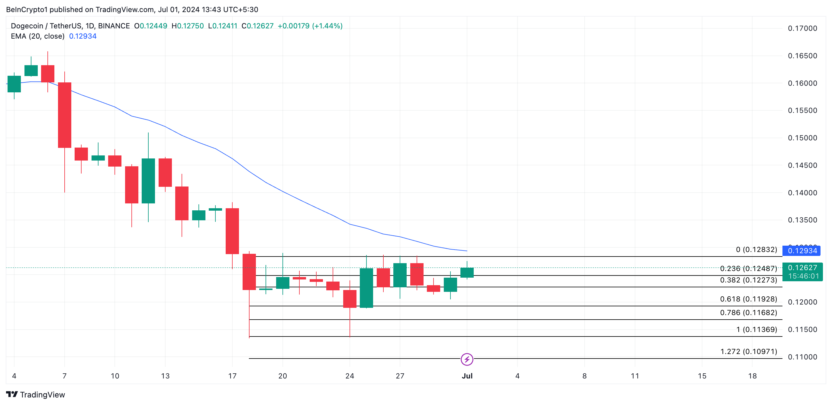 DOGE’nin değerindeki son ralliyi takiben, fiyatı 20 günlük üstel hareketli ortalama (EMA) seviyesine doğru ilerliyor. Günlük grafikte gözlemlendiğinde, meme coinin fiyatı bu önemli hareketli ortalamanın üzerine çıkmaya hazırlanıyor.