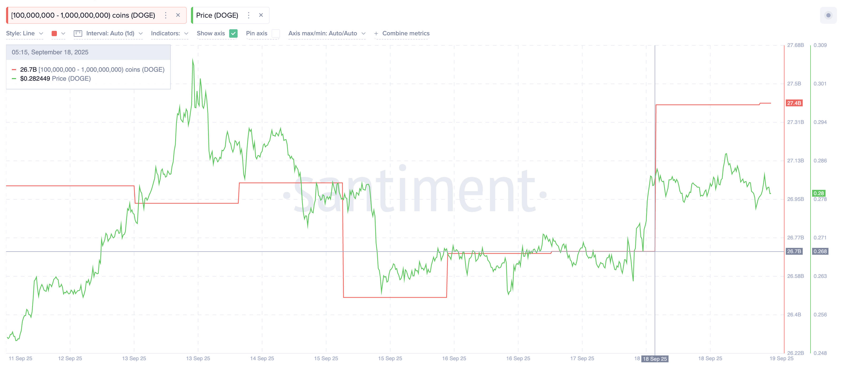 Fed faiz indirimi heyecanı yatıştıktan ve Dogecoin ETF’si CBOE’de (Chicago Board Options Exchange) piyasaya sürüldükten sonra büyük sahipler harekete geçti. 100 milyon ile 1 milyar DOGE tutan grup, 17 Eylül’de 26,7 milyar olan bakiyelerini 18 Eylül’de 27,4 milyara çıkardı.