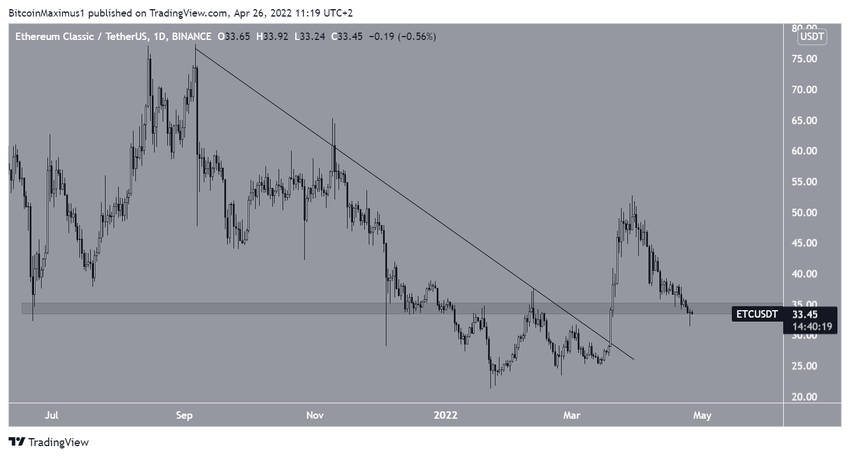 Ethereum Classic (ETC) 19 Mart’ta alçalan direnç çizgisinden çıkış gerçekleştirdi. Ayrıca 29 Mart’ta 52,66 dolar seviyesinde bir tepe meydana geldi. Ancak altcoin, tepe seviyeye ulaştıktan sonra değer kaybetmeye başladı. Böylece 25 Nisan’da 31,38 dolar seviyesinde bir dip oluştu.