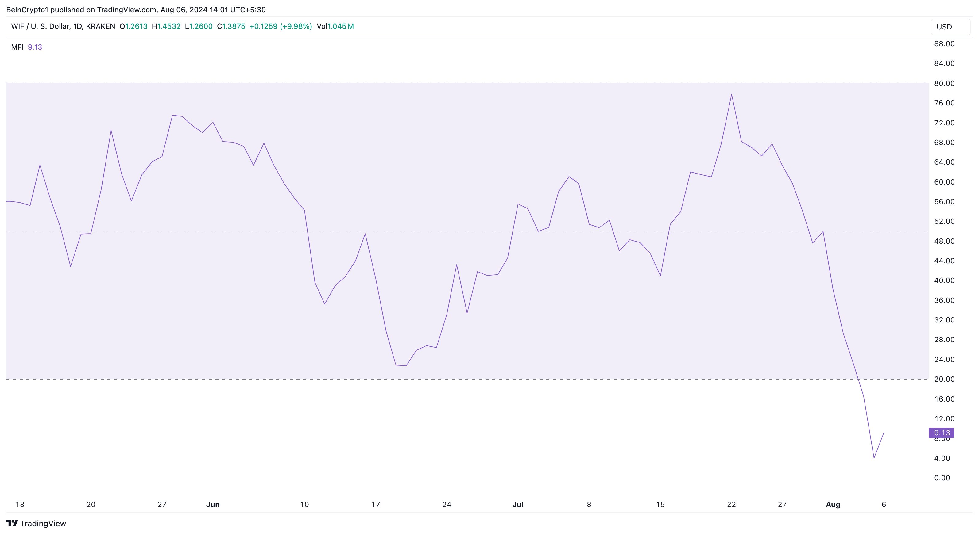 Bir kripto para biriminin sürekli sıçrama yapabilmesi için artan satın alma baskısına ihtiyacı vardır. Ancak, Para Akışı Endeksi’nden (MFI) gelen sinyaller, Dogwifhat’ın bu durumda olmadığını gösteriyor. MFI, fiyat ve hacim verilerini kullanarak alış ve satış baskısını ölçer. 0’dan 100’e kadar değişir; 20 ve altı aşırı satımı, 80 ve üzeri ise aşırı alımı gösterir.