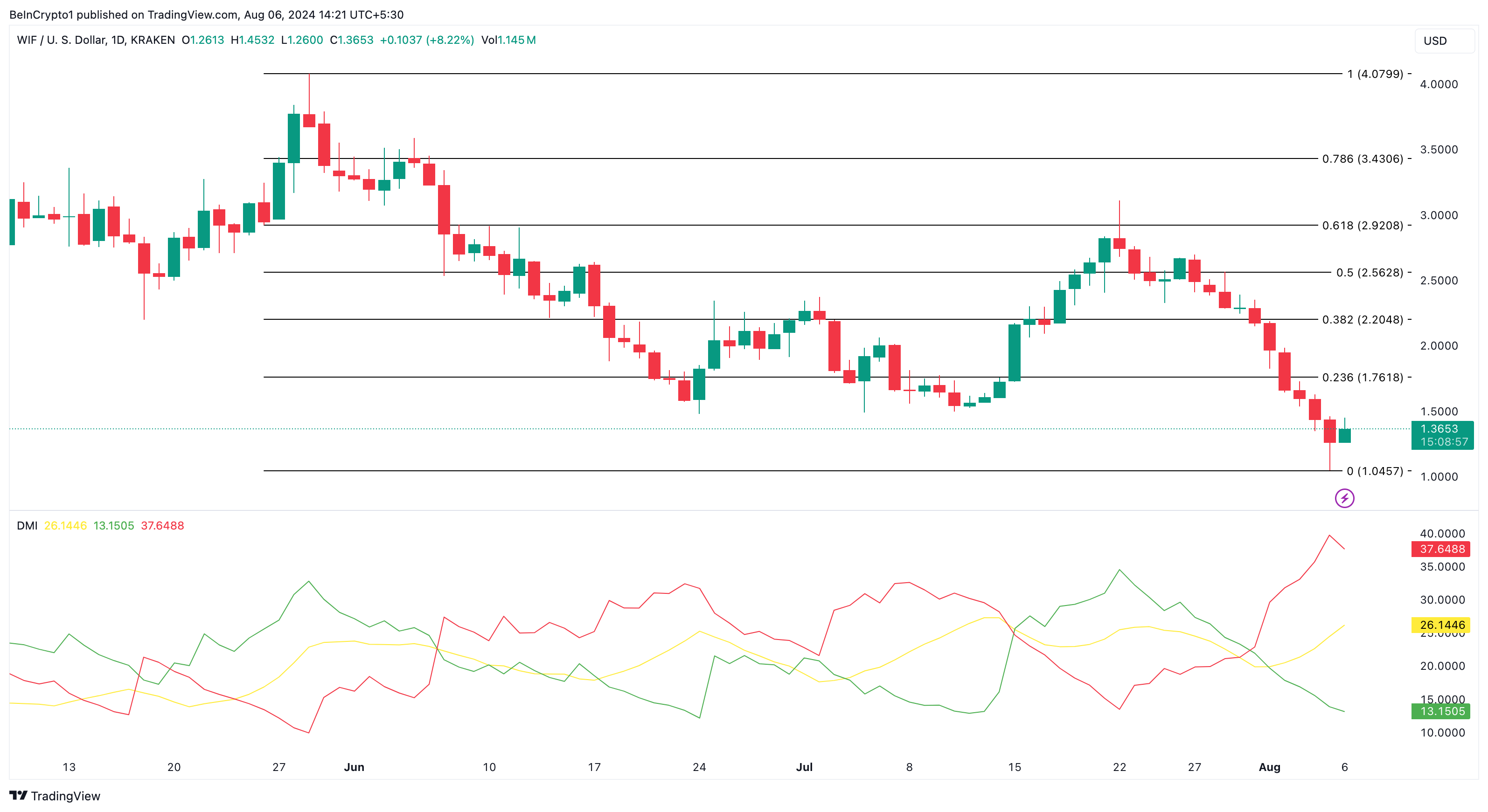 Yönlü Hareket Endeksi (DMI) tarafından gösterilen sinyaller, fiyat artışına rağmen WIF’in büyük ölçüde düşüş eğiliminde olduğunu ortaya koyuyor. DMI, bir kripto para biriminin fiyatının gücünü ve yönünü belirlemeye çalışır.