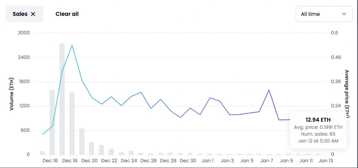 Ünlü Non Fungible Token platformu olan OpenSea, Donald Trump NFT’lerine dair dikkat çeken veriler sundu. Verilere göre koleksiyon, 18 Aralık 2022’de 2855 ETH’lik hacim ile zirve yaptı. Ancak bir ay içinde satışlar neredeyse %98 düştü. BeInCrypto analisti Harsh Notariya, koleksiyona yönelik ilgiye yönelik olarak taban fiyatlarının takip edilmesini önerdi. Mevcut durumda, koleksiyonun taban fiyatı %80 oranında düştü. Ayrıca 0,84 ETH ile daha önce zirveye ulaşan ortalama satış fiyatı 12 Ocak günü 0,20 ETH’ye kadar geriledi.