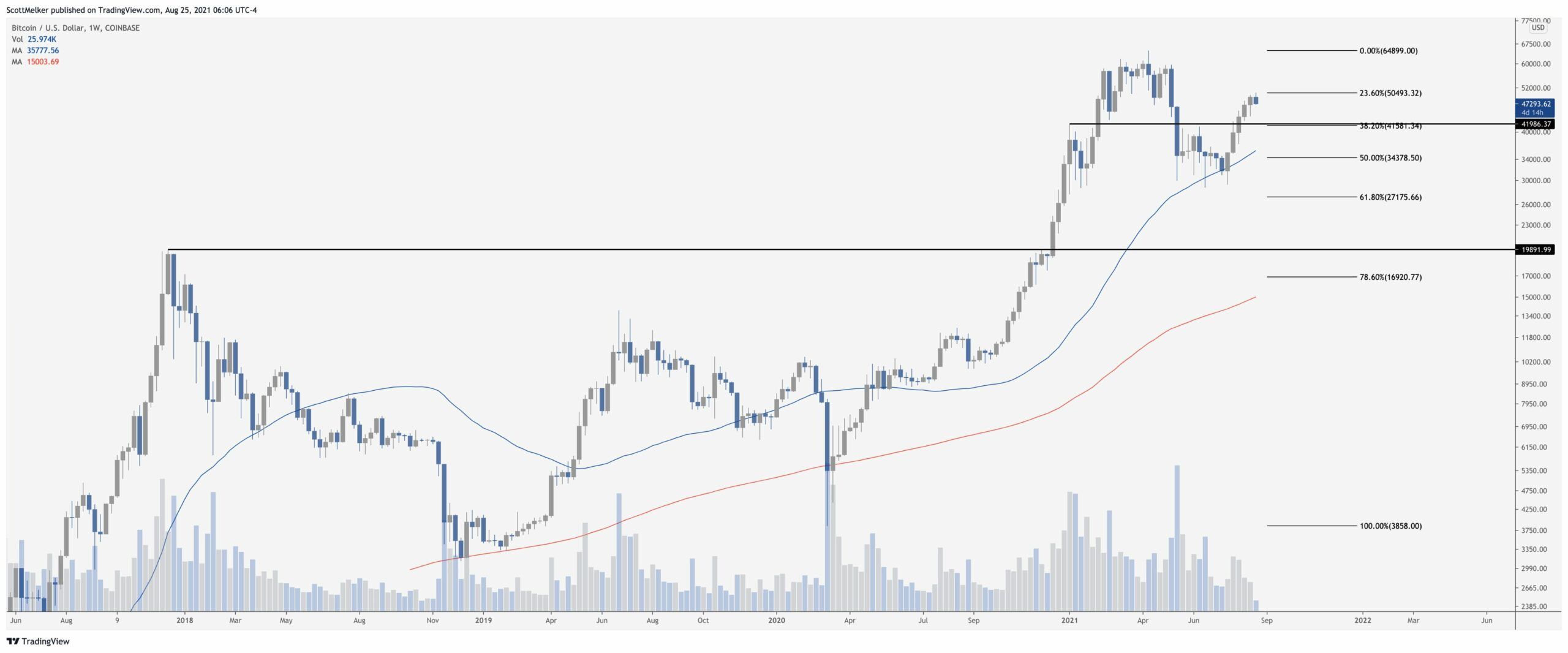 Ünlü yatırımcı, yaptığı paylaşımın devamında haftalık bir grafik paylaşarak, bu düzeltme hareketinin uzun vadeli grafiklerde Bitcoin (BTC) fiyatı için bir miktar daha düşüşü getirebileceğini söyledi. Melker, destek bölgesi için 40-42 bin dolar aralığını yükselişi soğutması adına önemli buluyor:
