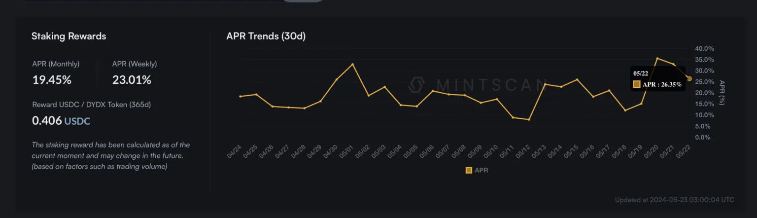 SponsoreddYdX, protokol ücretlerinin %100’ünü native token yerine USDC olarak stake edenlere dağıtıyor. Protokol, bugün itibarıyla 21.000’den fazla stake edene 24,6 milyon dolar tahsis etti. Mintscan’e göre, şu an DYDX staking için yıllık yüzde getiri (APR) %19.45 seviyesinde bulunuyor.