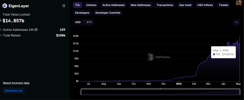 EigenLayer, 2023’teki başlangıcından bu yana merkezi olmayan finans (DeFi) sektöründe kilit bir oyuncu olarak hızla yükseldi . DefiLlama’ya göre şu anda 14,85 milyar dolarlık kilitli toplam değeri (TVL) ile en büyük ikinci DeFi protokolü olarak sıralanıyor .