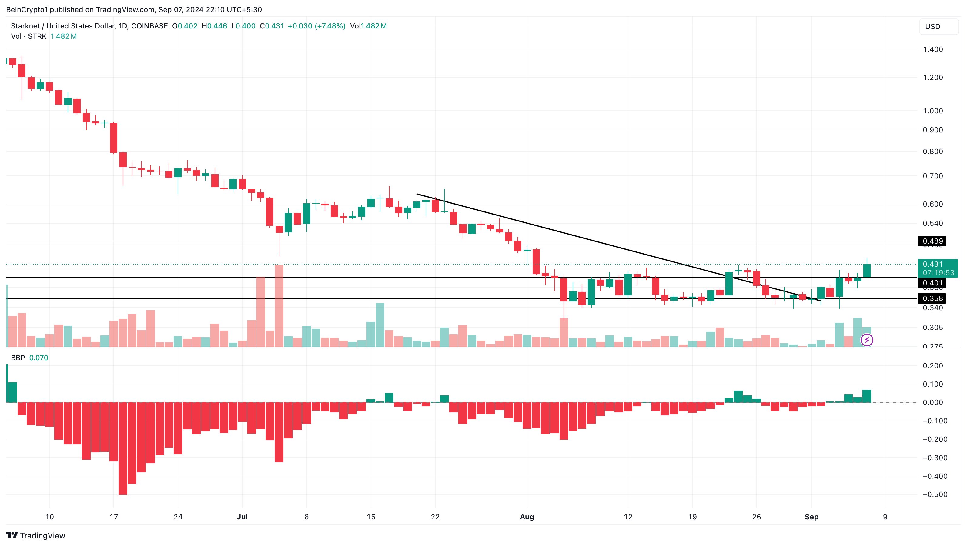Bull Bear Power (BBP) göstergesi, boğa momentumunun bir kez daha ayı baskısını aştığını gösteriyor, bu da başka bir potansiyel yükselişi öngörüyor. Ayrıca, STRK’nin düşüş trend çizgisinin üzerine çıkması, boğa görünümünü daha da destekliyor.