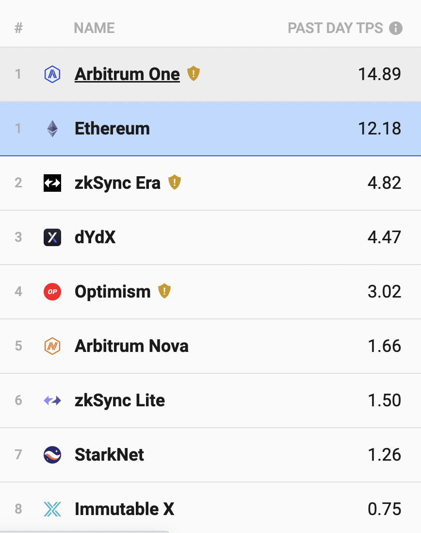 l2beat verilerine göre, son günlerde TPS’i ortalama olarak 14,8 olan Arbitrum (ARB) zirvenin sahibi oldu. ARB’nin hemen ardından 12,18 ile Ethereum ağı geldi. Dikkat çekici şekilde etkinlik açısından en popüler üçüncü blockchain henüz tam sürüme geçmeyen zkSync Era oldu.