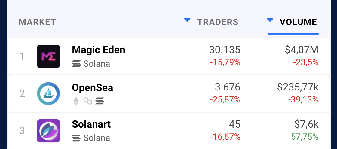 Magic Eden, Solana ekosisteminde gerçekleşen NFT işlem hacmi bakımından 4 milyon dolar ile ilk sırada yer alıyor. OpenSea işlem hacmi 235 bin dolarda kalırken son zamanlarda yatırımcıların ilgisini kaybeden Solanart işlem hacmi sadece 7 bin dolar.