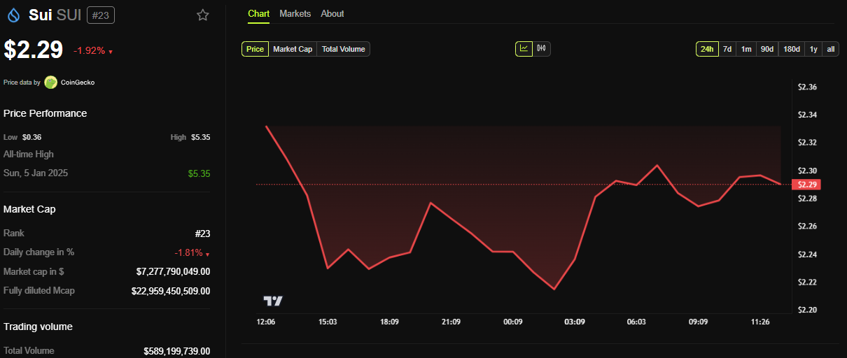 BeInCrypto verilerine göre SUI, bu yazı yazılırken 2,29 Dolar’dan işlem görüyor ve son 24 saatte neredeyse %2 düşüş yaşadı.