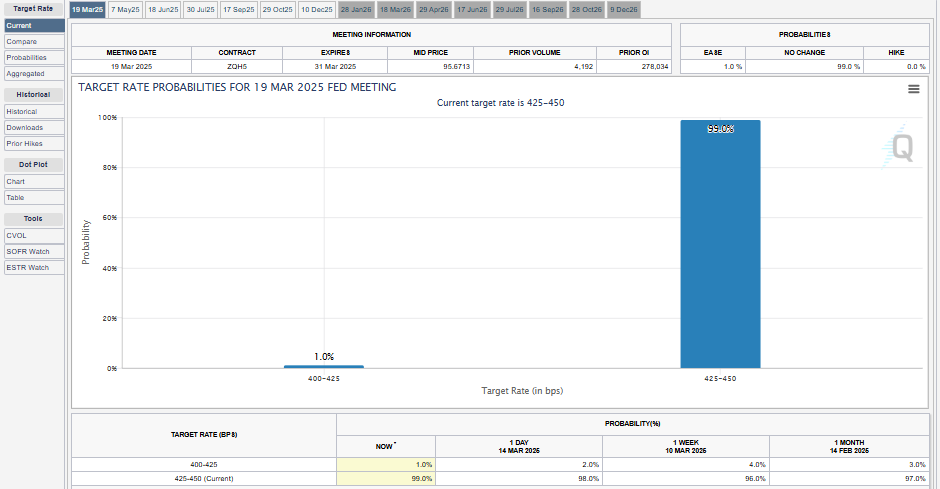 BeInCrypto’nun bildirdiğine göre, bu hafta Bitcoin duyarlılığını etkileyen ABD ekonomik verileri arasında yer alıyor. CME FedWatch Tool’a göre, piyasa konsensüsü oranların %4,25 ile %4,5 arasında sabit kalacağını öngörüyor. Son ekonomik veriler, güçlü bir iş piyasası ve enflasyonun %2,8’e soğuduğunu gösteriyor—hala Fed’in %2 hedefinin üzerinde- bu beklentiyi güçlendiriyor.