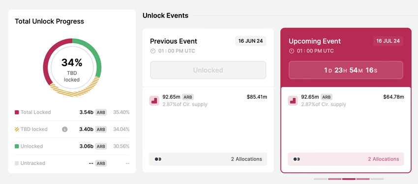 Bu hafta birkaç jetonun kilidinin açılmasına tanık olacak. 16 Temmuz’da Arbitrum, mevcut piyasa fiyatıyla yaklaşık 66 milyon dolar değerinde 92,6 milyon ARB tokeninin kilidini açacak. Kilidi açılmış bu tokenler ekibine, danışmanlarına ve yatırımcılarına gidecektir.