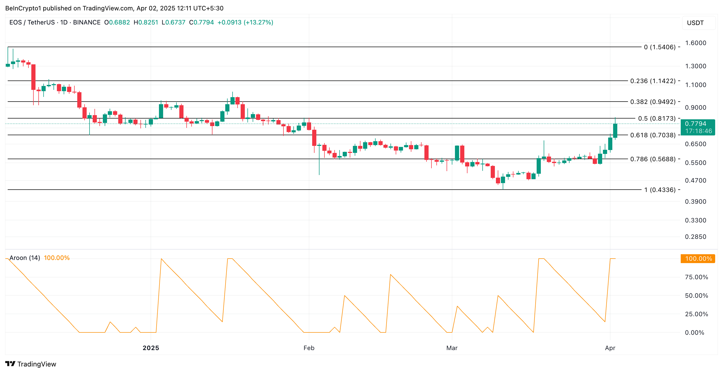 Ancak uyarı işaretlerine rağmen, EOS’un Aroon Up Line, yükseliş momentumunun güçlü kaldığını gösteriyor. Alım aktivitesi devam ederse, daha fazla yükselişin mümkün olabileceğini belirtiyor. Basın zamanında bu %100 seviyesinde.