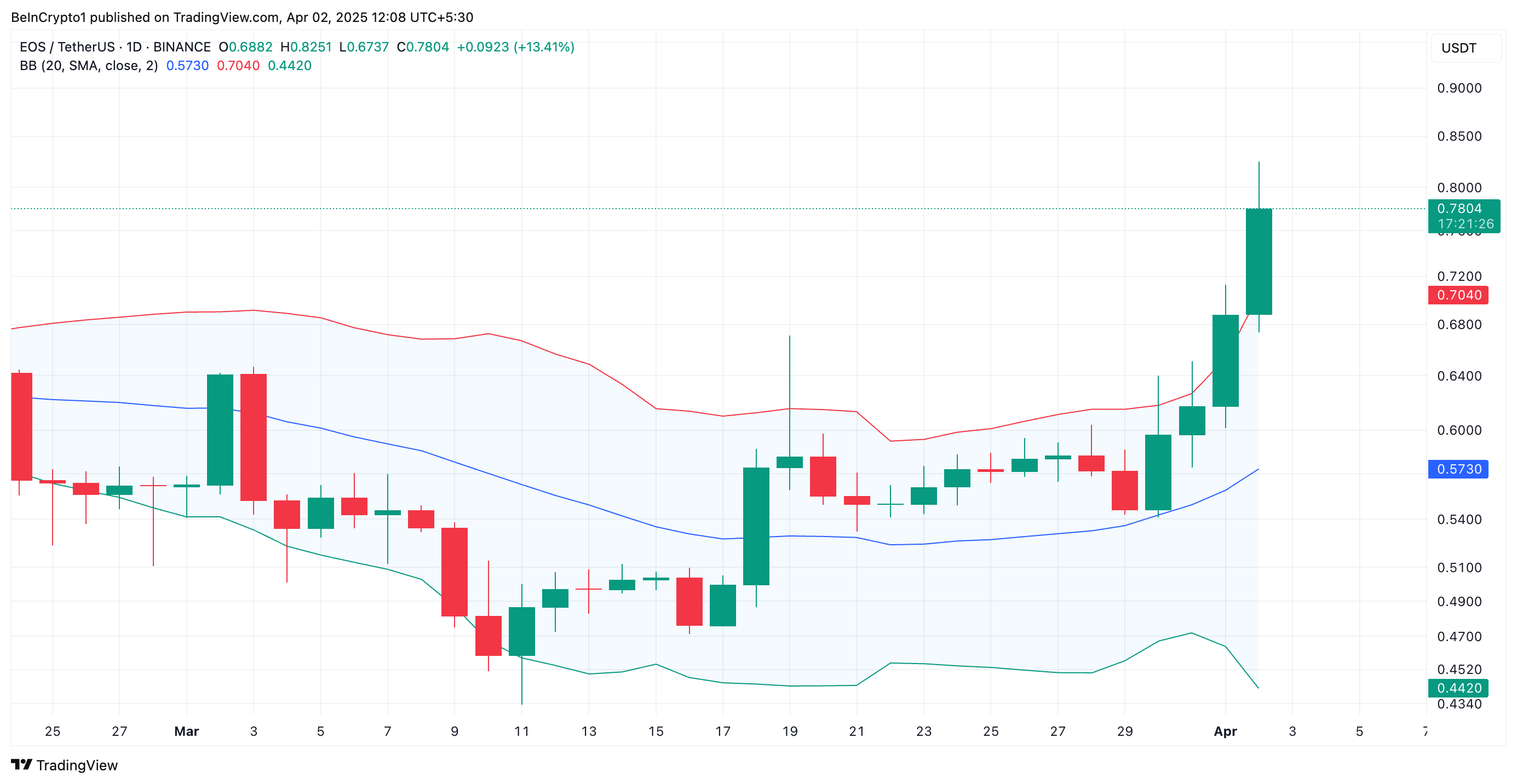 Piyasa toparlandıkça, EOS boğaları yeniden hakimiyet kazandı ve 30 Mart’ta kanalın üzerinde bir kapanış tetikledi. O zamandan beri EOS, yükseliş trendini sürdürerek %32 artışla basın zamanında iki ayın en yüksek seviyesi olan 0,78 Dolar’dan işlem görüyor.