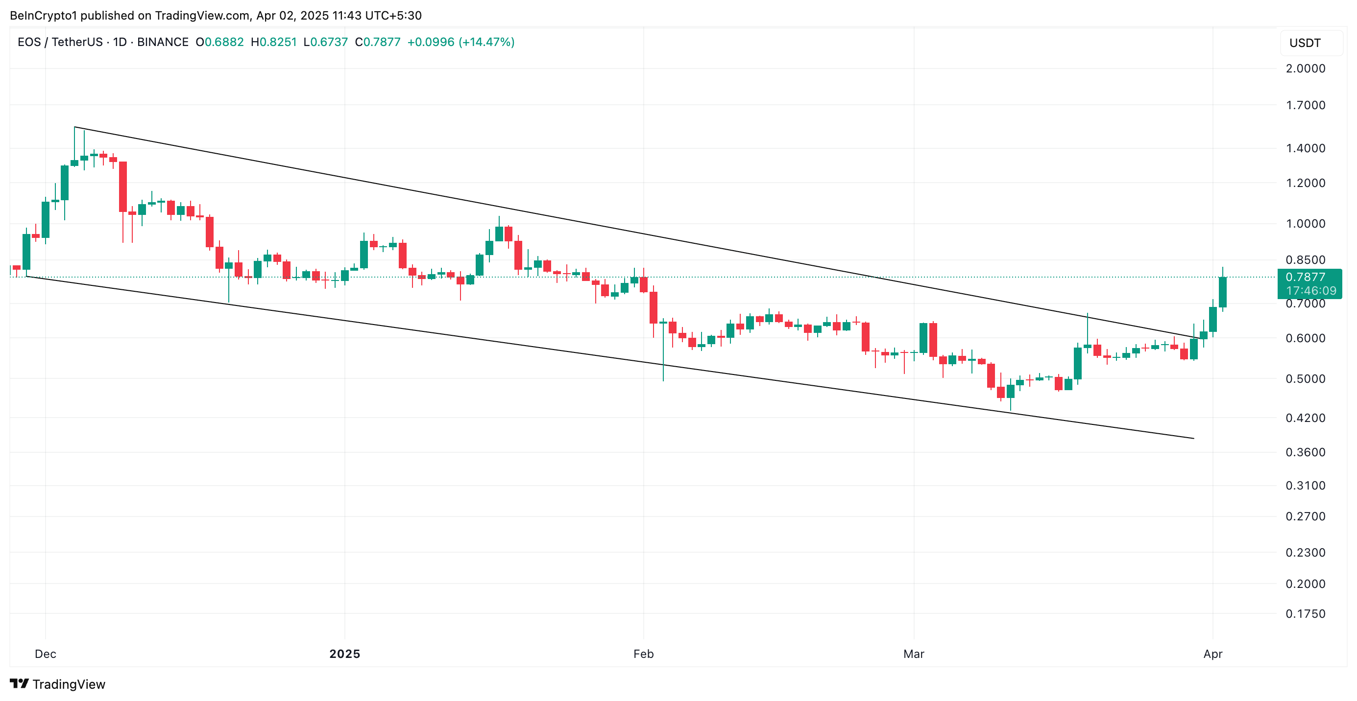 Bağlam için, bu düşüş kanalı 4 Aralık’tan beri EOS’u 1 Dolar seviyesinin altında tutuyordu. O tarihten 30 Mart’a kadar, kanal içinde işlem görürken EOS’un fiyatı %70 düştü.