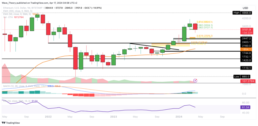 Aylık grafikte, Ethereum’un fiyatı 0,382 Fibonacci destek seviyesinin yakınında konumlanmaya devam ediyor. Potansiyel bir yükseliş senaryosu, bu seviyenin üzerinde bir aylık kapanış gerektiriyor ve kripto para birimi için olumlu bir ivme sinyali veriyor. Ancak bu desteğin korunamaması, Fibonacci desteğinin 2.500 dolar civarında olmasıyla birlikte daha fazla düşüşe yol açabilir.