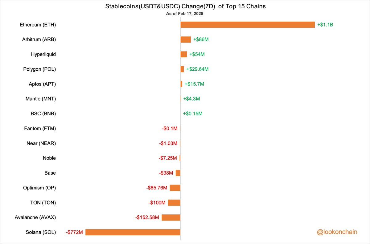 Solana meme coin’leri etrafındaki tartışmaların ortasında, Lookonchain verileri sermayenin Ethereum’a kaydığını gösteriyor. Son yedi günde, Ethereum üzerindeki stablecoin (USDC ve USDT) varlıkları 1,1 milyar Dolar artarken, Solana’dan 772 milyon Dolar değerinde stablecoin çıktı.