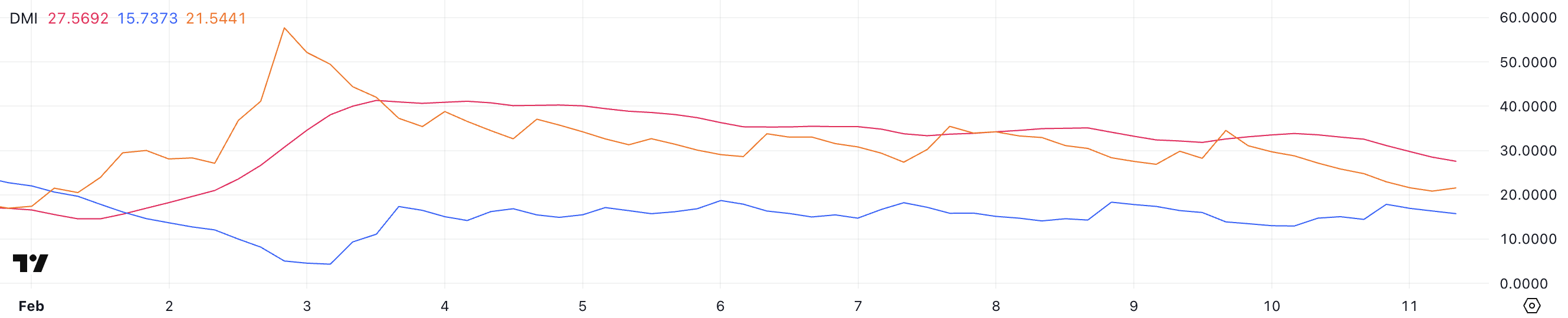 -DI hala +DI’nin üzerinde olduğundan, ayılar hafif bir üstünlük sağlıyor, ancak düşen ADX trendin ivme kazanmadığını gösteriyor.