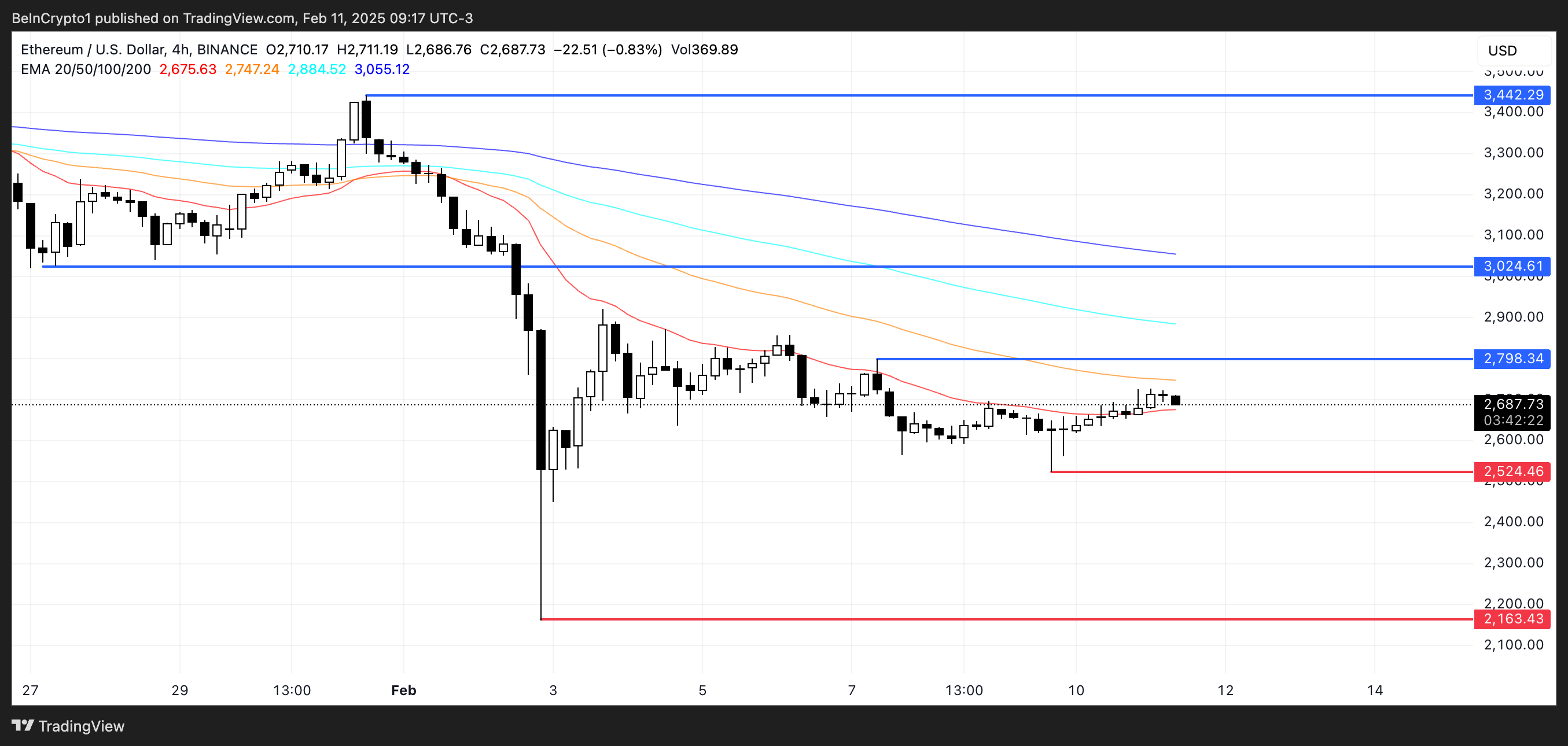 Ethereum fiyat grafiği, EMA çizgilerinin hala düşüş yapısını gösterdiğini, kısa vadeli hareketli ortalamaların uzun vadeli olanların altında konumlandığını gösteriyor.