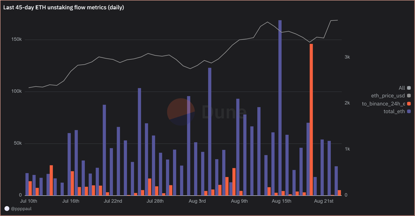 Unstaking işlemi otomatik olarak satış anlamına gelmez. Birçok yatırımcı, daha yüksek fiyatlar veya DeFi fırsatları için ETH’lerini elinde tutabilir. Dune Analytics verileri, son 45 gün içinde unstaking hacmi ile ETH fiyatı arasında güçlü bir bağlantı olmadığını gösteriyor.