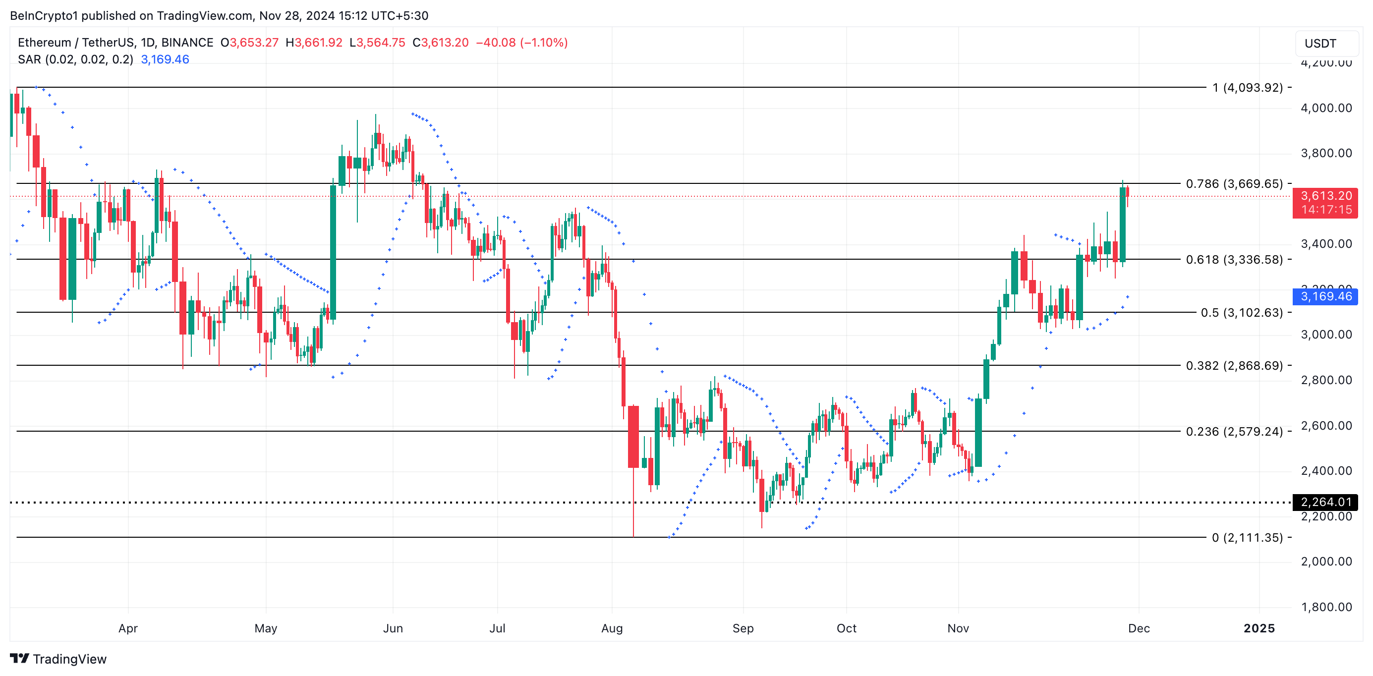 Buna rağmen, Ethereum piyasasındaki genel yükseliş eğilimi güçlü kalmaya devam ediyor, bu da yükseliş trendinin sürebileceğini gösteriyor. ETH’nin Parabolik Stop ve Ters (SAR) göstergesinin günlük grafikteki kurulumu, bu yükseliş görünümünü doğruluyor.
