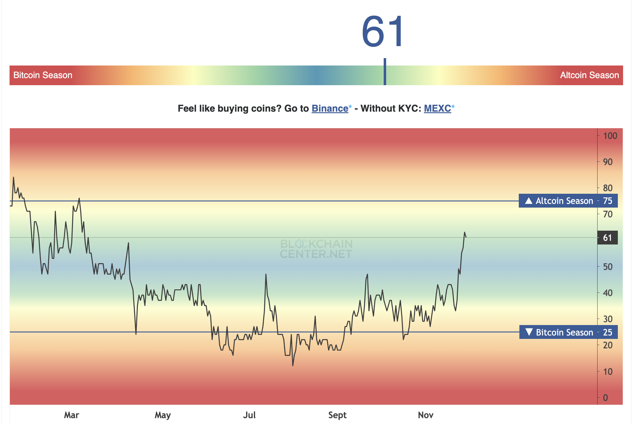 Ayrıca, Ethereum’un son yükselişi altcoin sezonuna doğru bir kayma olabileceğini gösteriyor. Blockchain Center’ın Altcoin Sezonu Endeksi’ne (ASI) göre, skor şu anda 100 üzerinden 61 seviyesinde. Bu da beklenen dönemin başlamasını işaret eden 75 puan eşiğine yaklaşıyor demek.