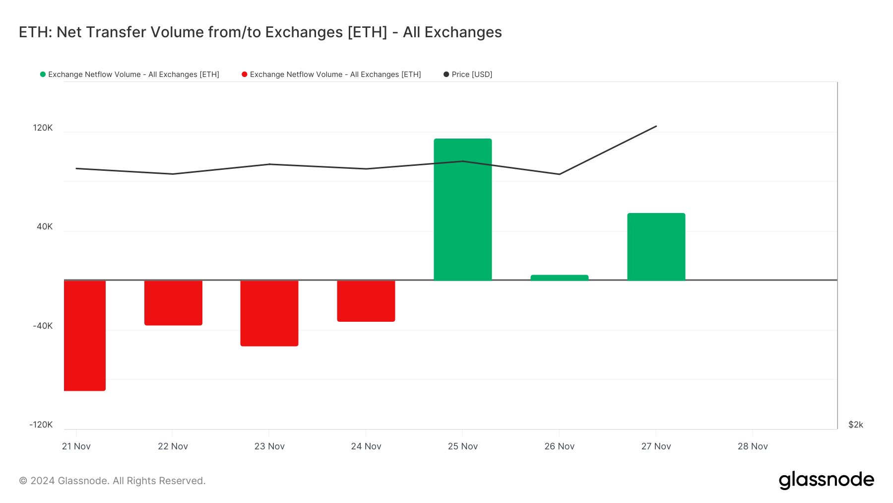 Dikkat çekici bir şekilde, bu fiyat artışı nedeniyle bazı kar realizasyonları şimdiden başladı. Bu durum, coin’in pozitif borsa net akış hacminde görülüyor. Çarşamba günü, 199 milyon doların üzerinde değere sahip 54.974 ETH borsalara gönderildi.