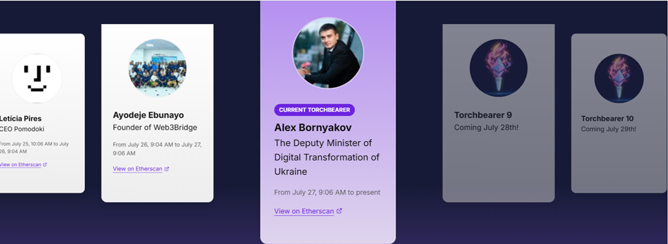 BeInCrypto, 20 Temmuz’dan bu yana önde gelen topluluk figürleri ve inşaatçılardan oluşan döner bir kadronun meşaleyi 24 saat boyunca tutacağını bildirdi. Bu yayından birkaç saat sonra bir sonraki sahip belirlenecek.