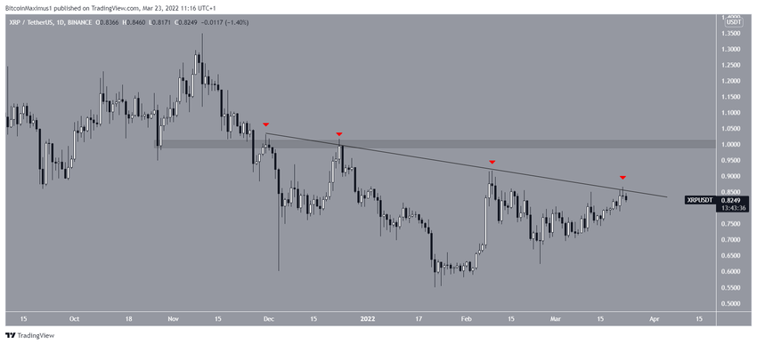 Ripple (XRP) 30 Kasım’dan bu yana alçalan bir direnç çizgisini takip ediyor. Ayrıca altcoin fiyatı, bu çizgiden dört kez reddedildi (kırmızı oklar). Son reddedilme ise 22 Mart’ta gerçekleşti.