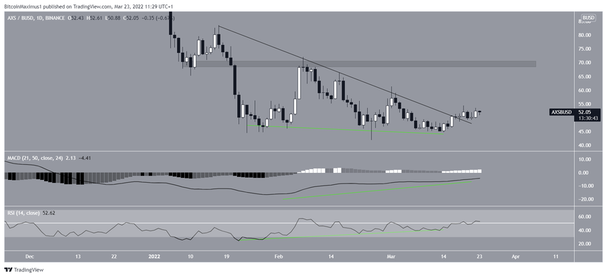 Axie Infinity (AXS) 17 Ocak’ta alçalan bir direnç çizgisini takip etmeye ve düşüş sergilemeye başladı. Ancak altcoin fiyatı, 18 Mart’ta direnç çizgisinden çıkış gerçekleştirdi. Ayrıca çıkış gerçekleşmeden önce pozitif uyumsuzluklar meydana geldi.