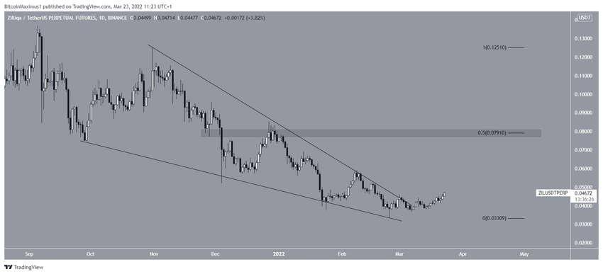 Zilliqa (ZIL) 28 Eylül’de alçalan bir takoz formasyonu içinde hareket etmeye başladı. Ancak 24 Şubat’ta sıçrama gerçekleşti ve aşağı doğru uzun bir fitil meydana geldi. Böylece altcoin, 8 Mart’ta formasyondan çıkış gerçekleştirme sürecine girdi.