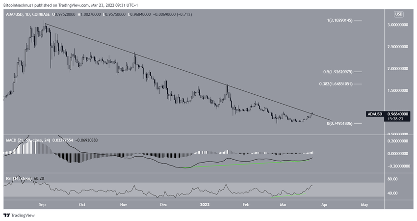 Düşüş hareketi, bir süre daha devam etti. Ancak günlük grafik ölçeğindeki MACD ve RSI’da, önemli bir pozitif uyumsuzluk meydana geldi (yeşil çizgiler). Bunun yanı sıra ADA fiyatı, direnç çizgisinden çıkış gerçekleştirme sürecine girdi.