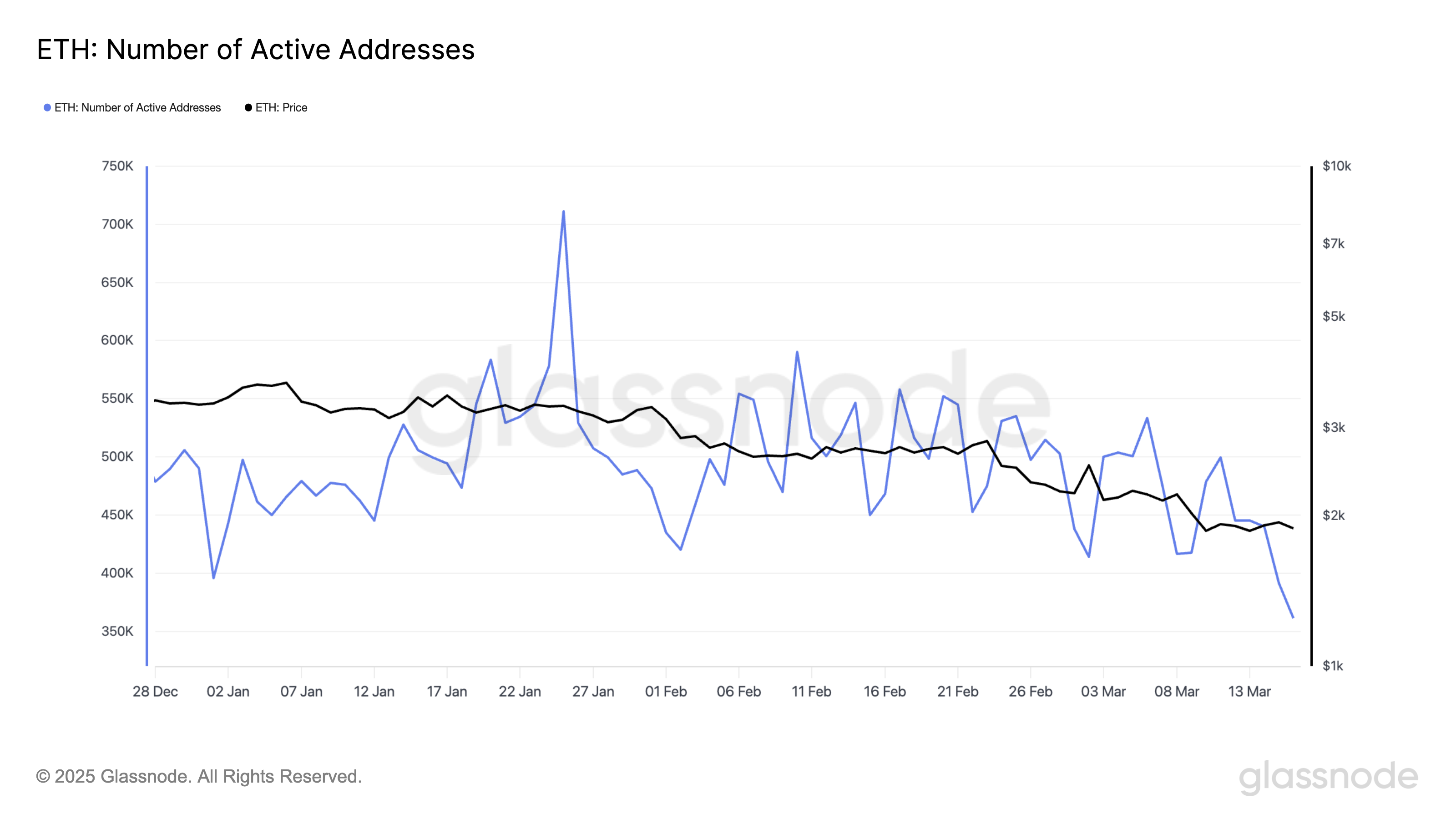 Glassnode’a göre, ETH işlemlerine dahil olan günlük aktif adres sayısı Pazar günü 361.078 ile yılın en düşük seviyesine indi.
