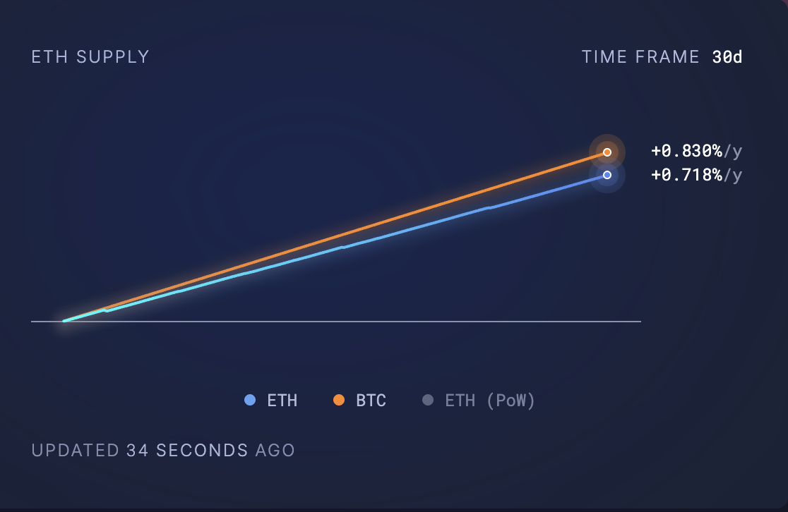 Ağ katılımındaki bu düşüş, ETH’nin enflasyonist baskılarını artırdı ve toplam dolaşımdaki arz 120 milyon ETH’yi aştı. Son 30 günde, mevcut piyasa fiyatlarıyla 135 milyon Dolar’ın üzerinde değere sahip 71.172 ETH, coin’in dolaşımdaki arzına eklendi.