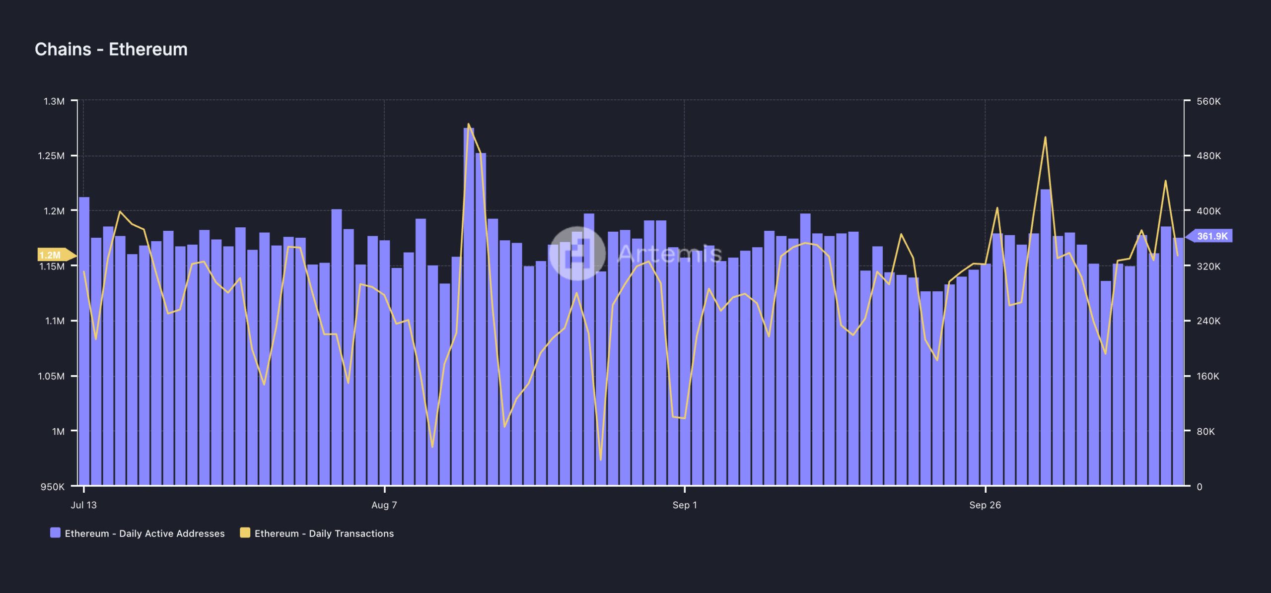 Son yedi gün içinde Ethereum ağında kullanıcı etkinliği arttı. Artemis’in verilerine göre, Layer-1 blockchain’de en az bir işlem tamamlayan benzersiz adreslerin günlük sayısı geçen hafta %21 artarak 362.000 oldu.