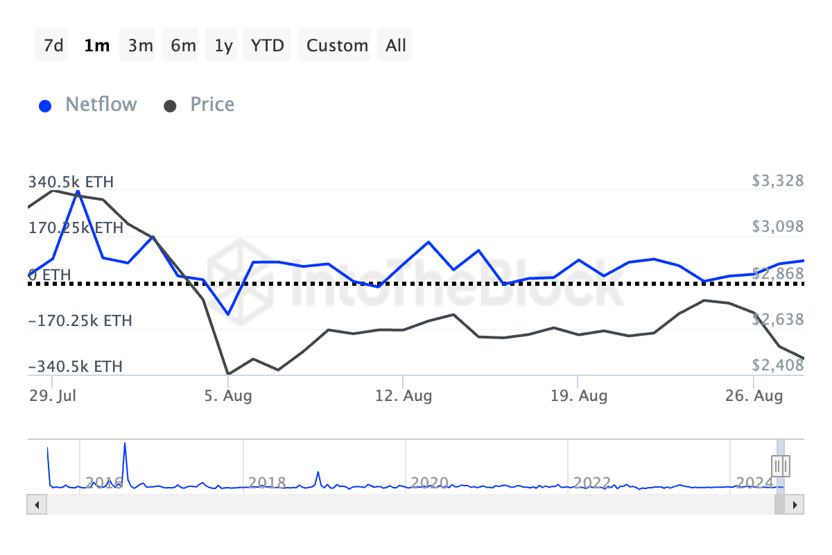 Ayrıca, büyük pay sahiplerin Ethereum (ETH) için net akışı %77 azaldı. Büyük paydaşlar veya balinalar, dolaşımdaki varlığın %0,1’inden fazlasına sahip olanlardır.