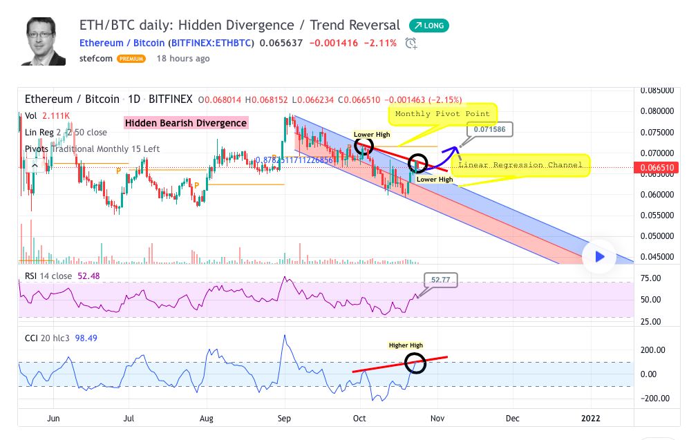 ETH/BTC paritesi incelendiğinde, günlük emtia kanal endeksinde (CCI) alçalan kanal görülüyor. Öte yandan kanal üst bandından daha yüksek pikler oluşması, paritenin düşüş trendiyle bir ayrılık yaşayabileceğini gösteriyor. Piyasa stratejisti Stefan Krecher, bu durumla alakalı olarak “Yüksek pikler, her zaman olası trend dönüşünün göstergesidir.” diye belirtti. Krecher, ETH/BTC paritesinin günlük göreceli güç endeksinin (RSI) “fazla yükseliş” sinyali vermemesi nedeniyle önümüzdeki günlerde dönüş yaşayabileceğinin altını çizdi.