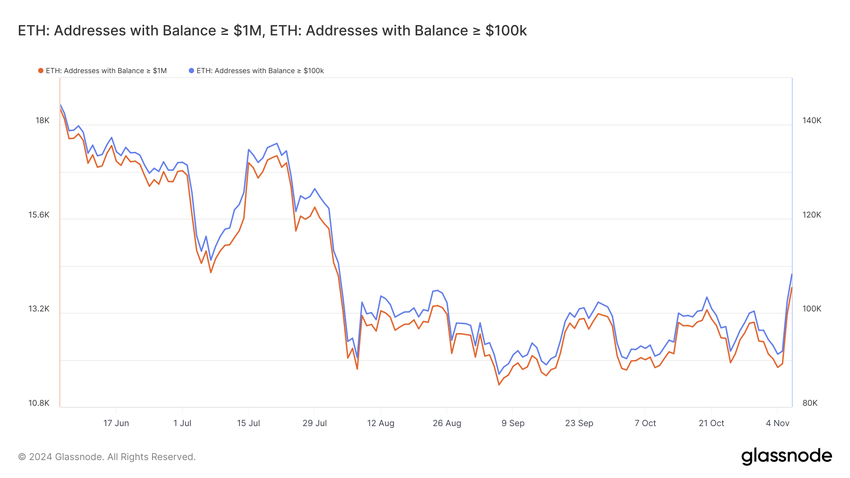 Ethereum balina aktivitesi önemli ölçüde arttı, büyük sahipler arasında güvenin yeniden canlandığını gösteriyor. 100.000 dolar değerinde ETH tutan adreslerin sayısı %17, 1 milyon dolar üzerinde tutanların sayısı ise %19 arttı. Bu yüksek değerli adreslerin büyük birikimleri, balinaların daha fazla kazanç beklediğini yansıtarak Ethereum’un gelecekteki fiyat performansına olan güveni artırıyor.