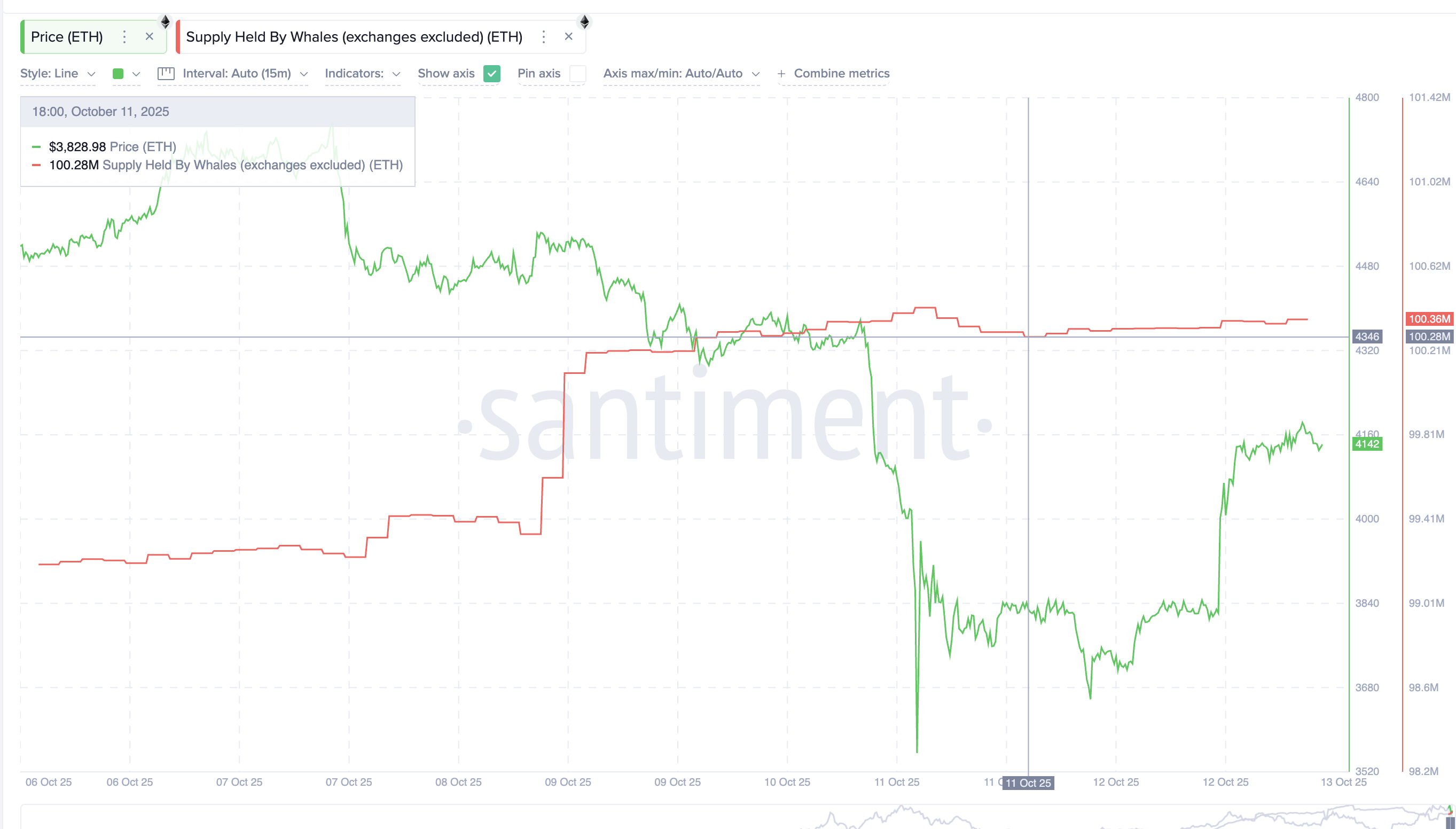 Ethereum’un mevcut toparlanması daha çok büyük cüzdanlar tarafından yönlendiriliyor gibi görünüyor. Santiment verilerine göre, balina cüzdanları 11 Ekim’den bu yana varlıklarını 100,28 milyon ETH’den 100,36 milyon ETH’ye çıkardı.