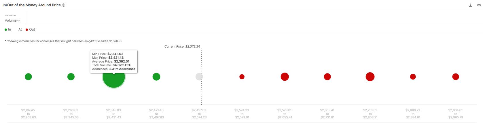 Ethereum’un In/Out of the Money Around Price (IOMAP) analizi, 2.345 Dolar ile 2.421 Dolar arasında kritik bir destek bölgesi belirliyor. Yaklaşık 164 milyar Dolar değerinde 64 milyonun üzerinde ETH token’ı bu fiyat aralığında satın alındı. Bu yoğunlukta sahipler, zararına satış yapma olasılığı düşük olduğundan güçlü fiyat desteği sunuyor.