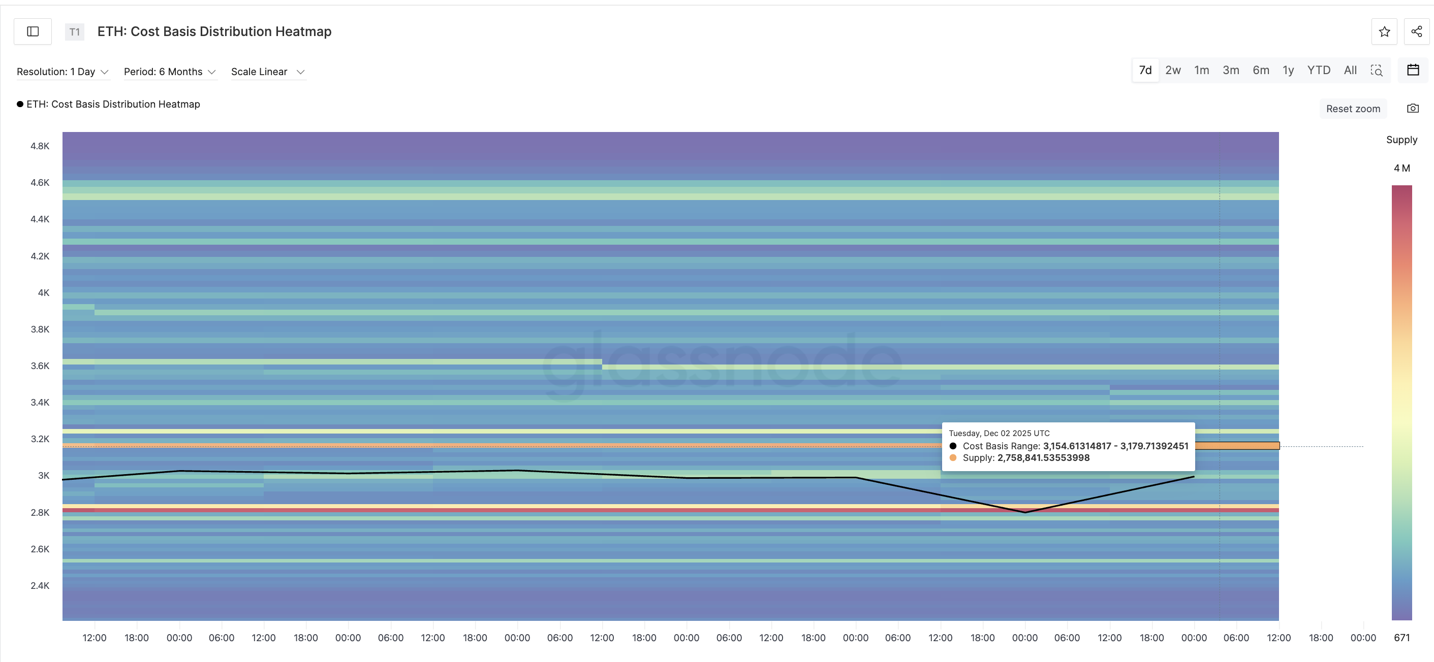ETH’nin Pectra tarzı bir genişleme gösterip göstermeyeceği, tek bir arz duvarının aşılmasına bağlıdır. Glassnode’un Maliyet Temeli Dağılımı, 3.154 dolar ile 3.179 dolar arasındaki en yakın vadeli en ağır arz kümesini ortaya koyuyor, burada yaklaşık 2,76 milyon ETH bulunuyor. Bu, grafikteki 3.166 dolarlık direnişle neredeyse mükemmel bir şekilde örtüşüyor (güçlü bir direnç ve destek hattı).